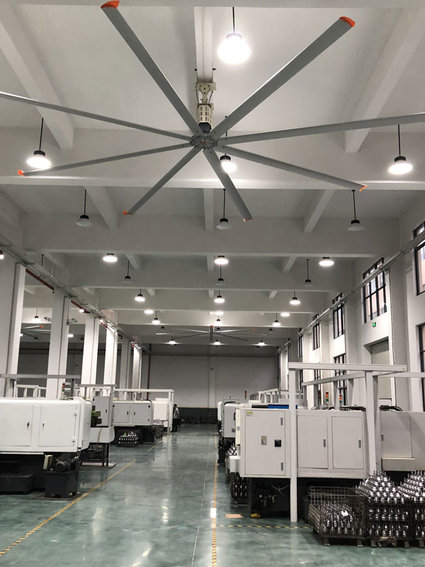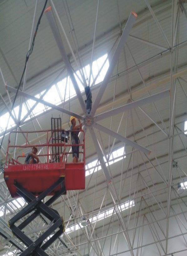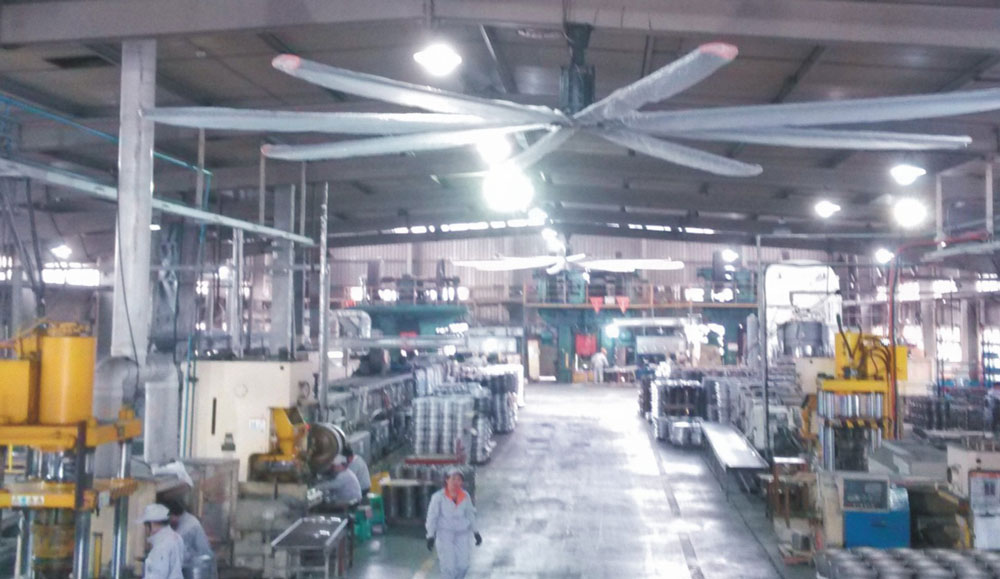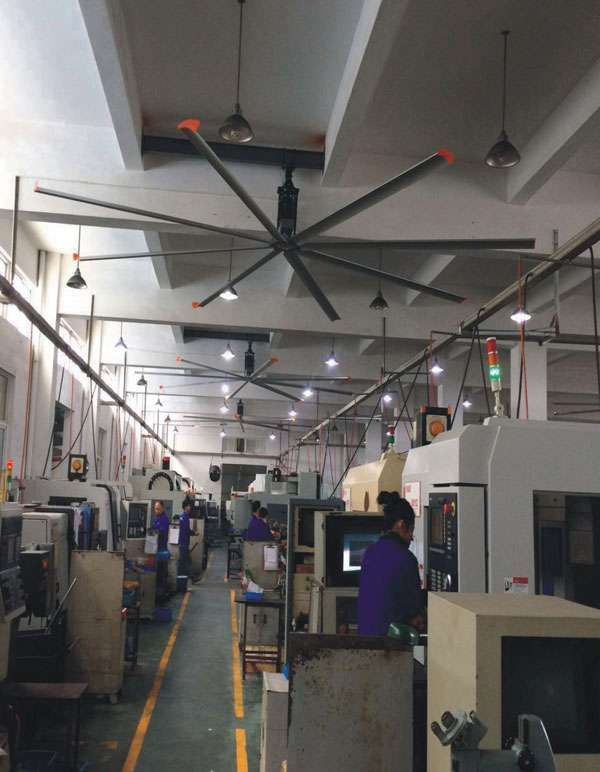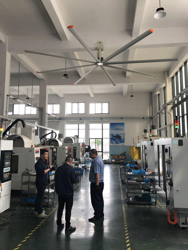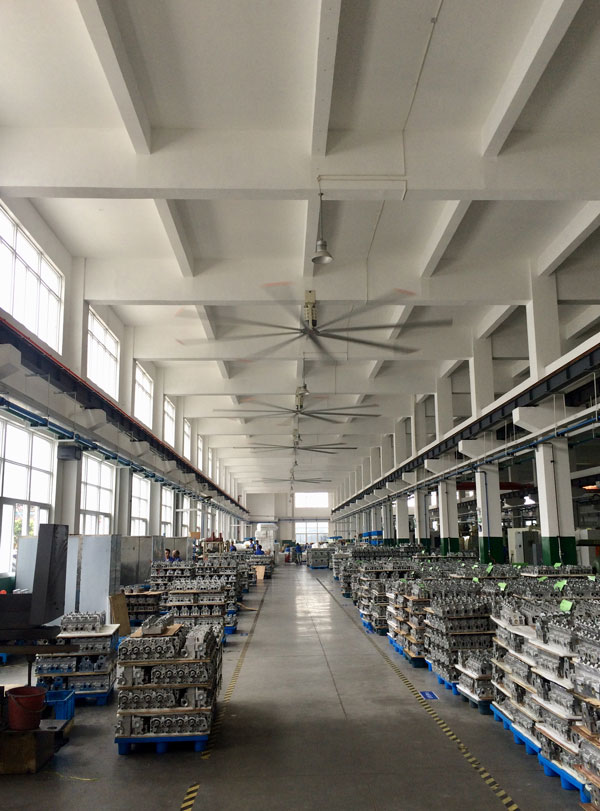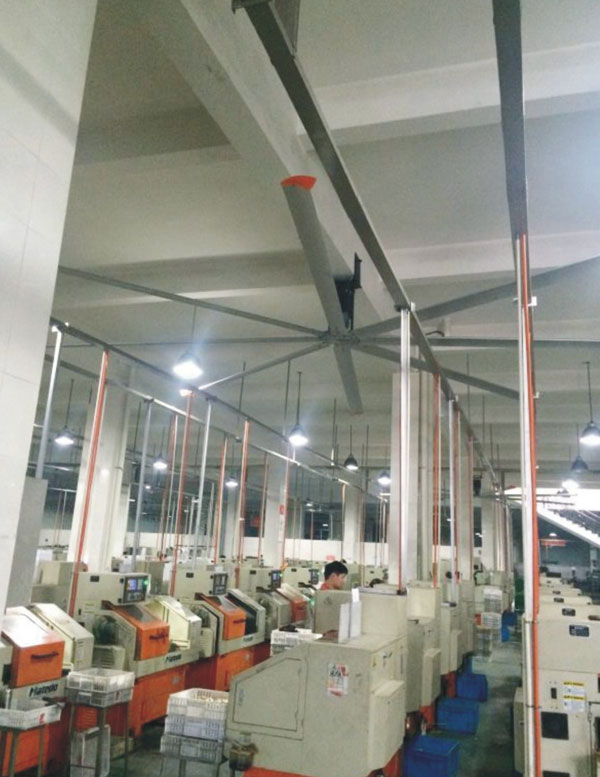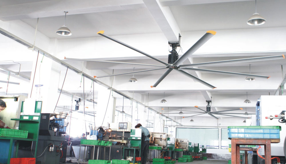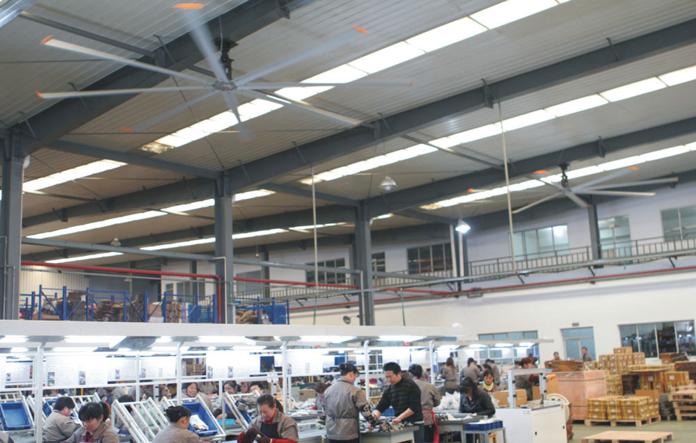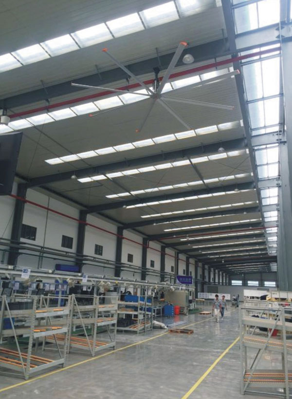 我公司生產的大型工業吊扇直接懸掛在廠房屋梁下,風力柔和,能加快車間空氣流通,有效降低車間內溫度,改善車間空氣環(huán)境質量,有利于員工的身體健康。